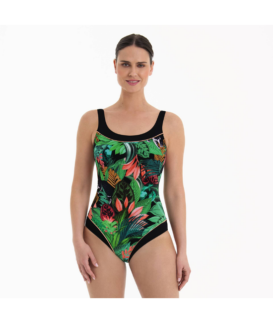 - Care badpak - Zonder beugel - Met ingenaaide hoesjes - Met lichte vulling voor een mooiere, ronde borst - Diepe V-rug - gouden boordje maakt de schijding tussen zwart en print op de buste en bovenbenen